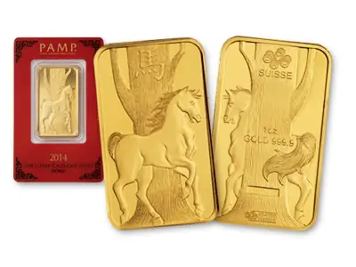 One of the most beautiful bars of gold that has ever been struck is the Year of the Horse Gold Bar by PAMP Suisse. Each one of these bars has intricate and ornate designs that have attracted collectors from around the world. The obverse side of the bar features a powerful and elegant horse as a symbol for both the nation of China and the gold that it covers. Above the horse’s head is the symbol for horse embedded in a tree. On the reverse side of the bar you will see the other side of the horse as it is wrapped around the tree, with the weight and purity of the gold shown.