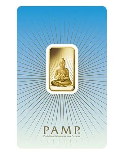 This newly designed 10 gram PAMP Suisse Gold Bar is manufactured in Switzerland, and is composed of 5 grams 999.9% fine gold. The Buddha Bar is one of five bars to be released as part of the PAMP Gold Series, with each uniquely designed in celebration of different religious figures, monuments and icons. The word Buddha means “awakened one” or “enlightened one”, born in Nepal in the 6th century B.C., Buddha was a spiritual leader and teacher whose life serves as the foundation of the Buddhist Religion. The reverse side of this bar captures the image of Buddha surrounded by diagonal lines. The obverse side features a circular PAMP logo, along with the words “SUISSE” “5g” “FINE GOLD” “999.9” and an individualized serial number. This bar is packaged in its original assay card which guarantees the Gold metal weight and purity.